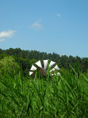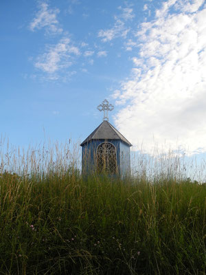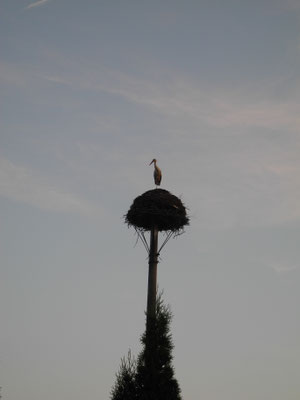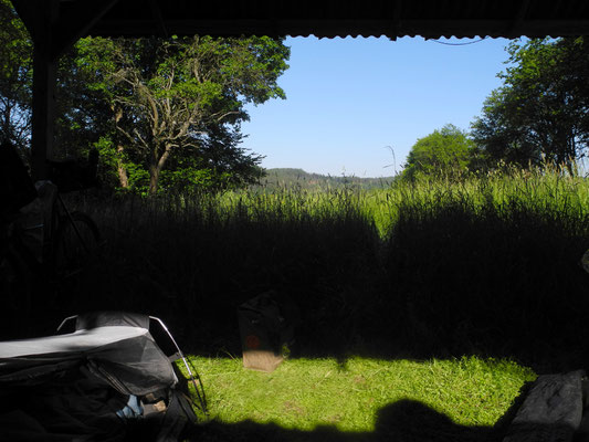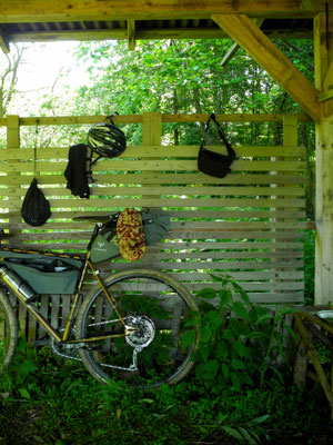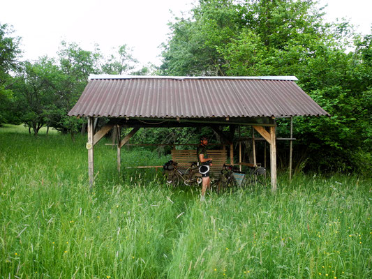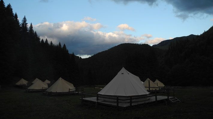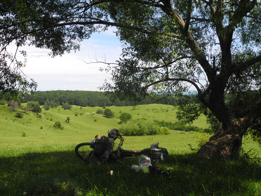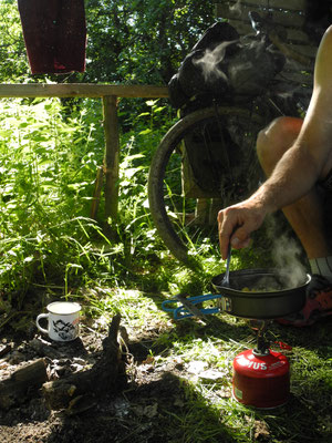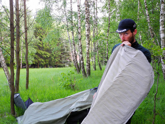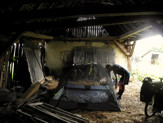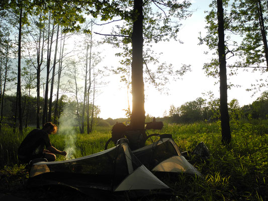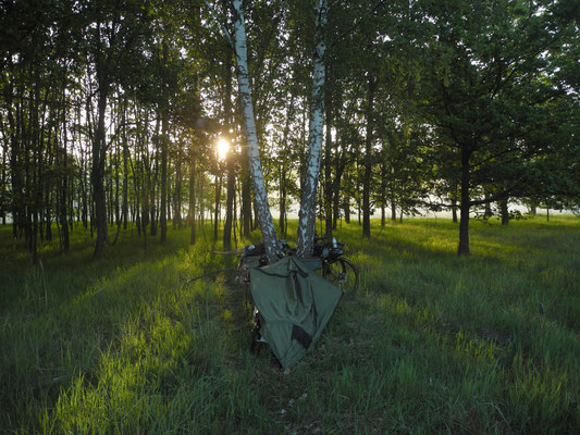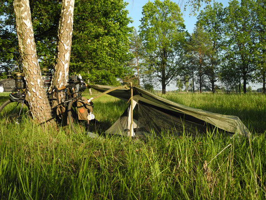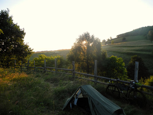 We found a nice camp spot on a meadow just outside a village. We scared away a young deer, had dinner and went to sleep with the setting sun.