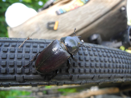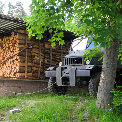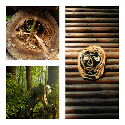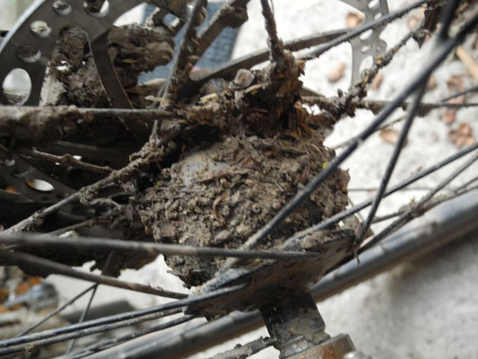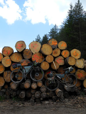 I spent the afternoon by chopping some more wood and with Rosi building a bear sculpture made from leftover bits of fire wood. When I checked on my bike I realized that one of my tires had gone