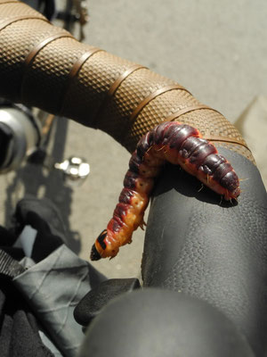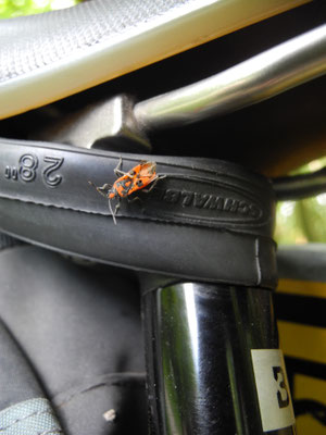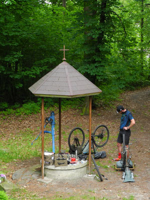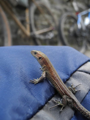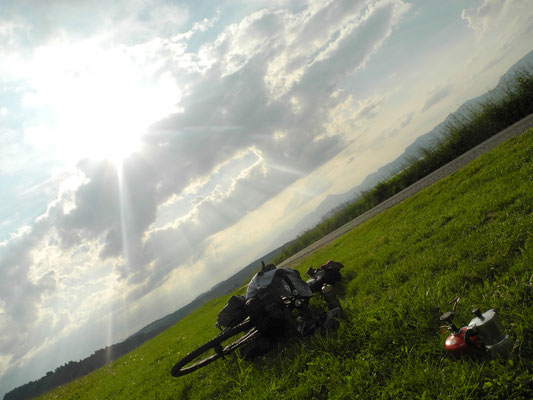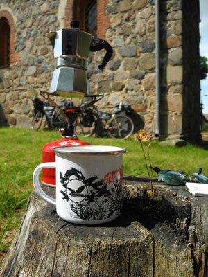 So the first coffee pause came after 9.8 km already. Earliest yet! We were both very happy that I took the little Bialetti on the road. I had to fix my first flat of this trip and we took the