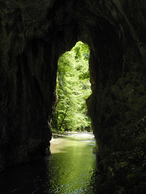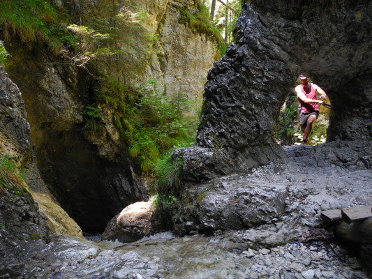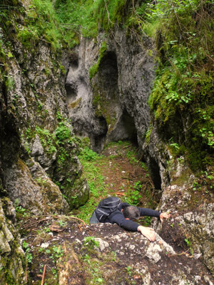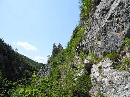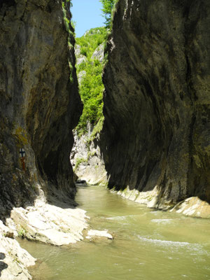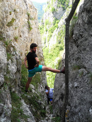The gorge eventually became a bit wider and the vegetation more lush. As we walked along, talking about this and that we suddenly heard a terrifying growl. I looked ahead and through the foliage, less than 20 m away I saw: a big fucking a bear! And two cubs! In the same moment I heard Arnold say: fugi, fugi, haide! Run, run, come on. And we fucking ran! We stopped only after having climbed down that technical section where we had to leave the dog behind.